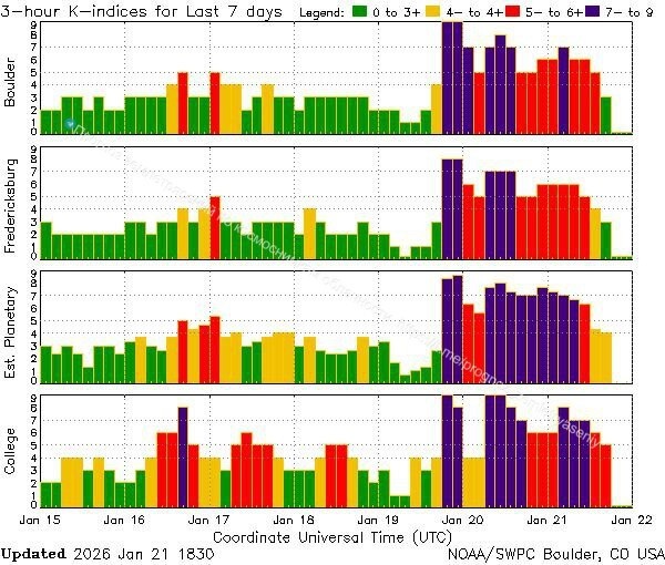 Магнитная буря ослабевает и свалилась в желто-зеленую зону К-индекса (фото 1). Межпланетное магнитное поле перестроилось (фото 2). Земля на это сразу же отреагировала событием М6.1 у вулканических островов Японии. Но впереди, судя по характерным отметкам в VLF, намечается еще одно сильное землетрясение (фото 3). Надо заметить, что серьезного влияния на траекторию полюса вращения Земли прошедшая сильная магнитная буря не оказала. Признаков петлевого отклонения полюса пока не наблюдается (фото 4). Сегодня вошли в гармонику Г-14 +/-2 дня от отклонения траектории 9 января, а это интервальное время, как и Г-21 - потенциальные даты для крупных сейсмособытий. По потенциальным зонам в фаворитах по-прежнему находится западное побережье северной Америки (М7-8) от Калифорнии до Аляски, а также Япония (М7-8). Есть вероятность (М6-7) по Центральной Америке, Перу и северу Индонезии. По Евразии остались вопросы по Ирану и Пакистану. В Океании в напряжении уровня М6-7 находятся Соломоновы острова и
