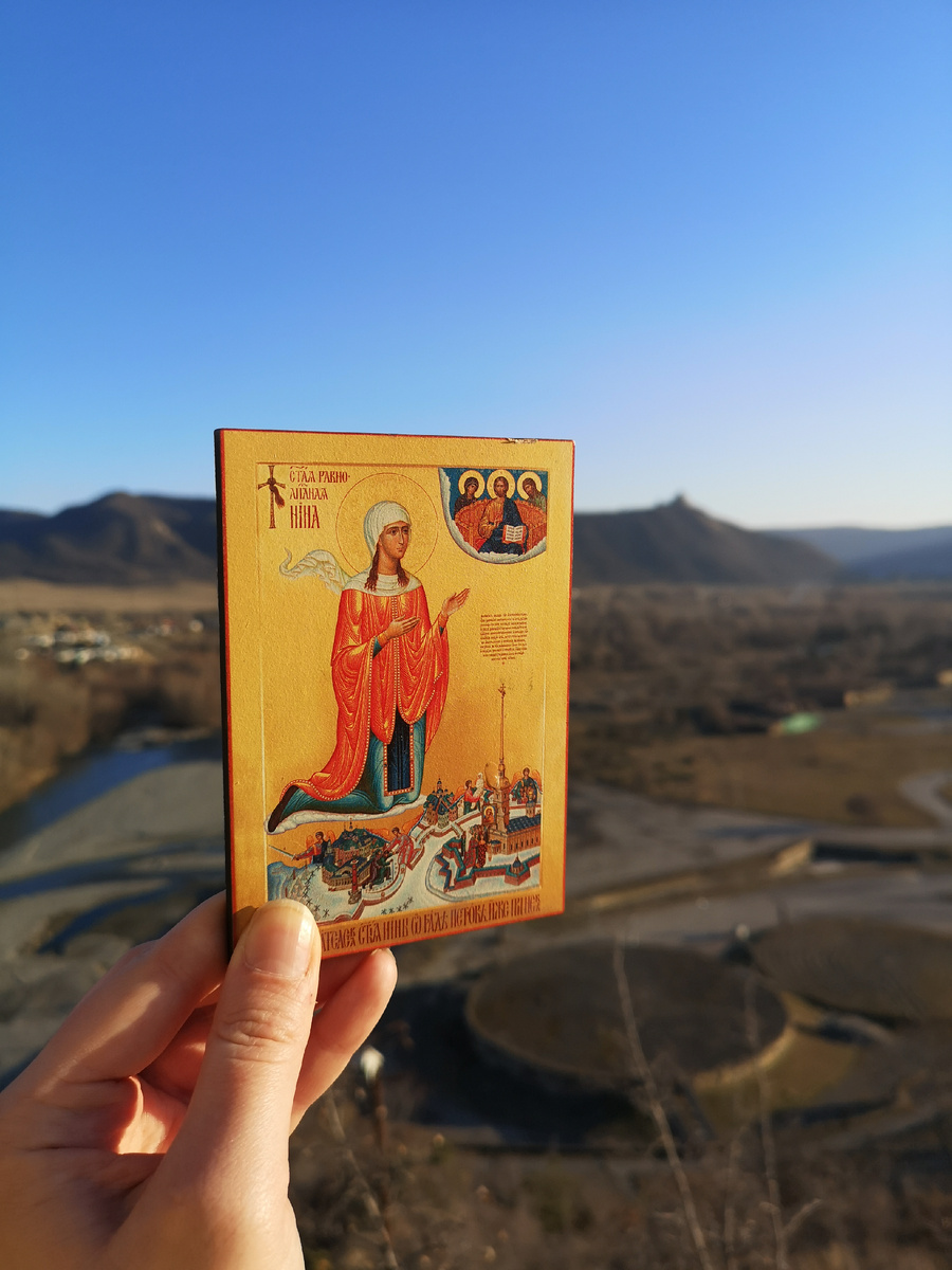 Святая Нина (Нино) оказалась в Грузии (тогда еще Иверии) по завету Девы Марии в 319 году. Она отправилась в эту страну, чтобы обратить местное население в христианство и глубоко почитается за то, что принесла туда веру. Нино - дева воин, хотя и названа равноапостольной.