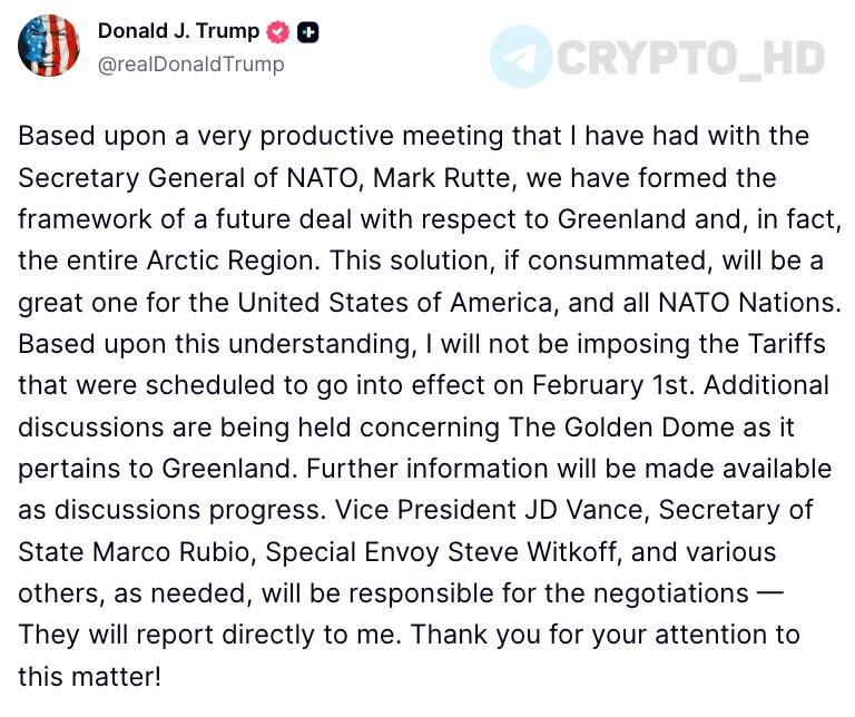 соглашения по Гренландии и, фактически, всему арктическому региону. Если это решение будет реализовано, оно станет большим достижением для США и всех стран НАТО. В связи с этой договоренностью я не стану вводить пошлины (❗️), которые планировалось ввести с 1 февраля. Также ведутся дополнительные переговоры относительно «Золотого купола» применительно к Гренландии. Дополнительная информация будет предоставлена по мере развития переговоров. Вице-президент Джей Ди Вэнс, госсекретарь Марко Рубио, специальный посланник Стив Виткофф и другие необходимые лица будут отвечать за переговоры – они будут отчитываться непосредственно передо мной. Cryptо Headlines