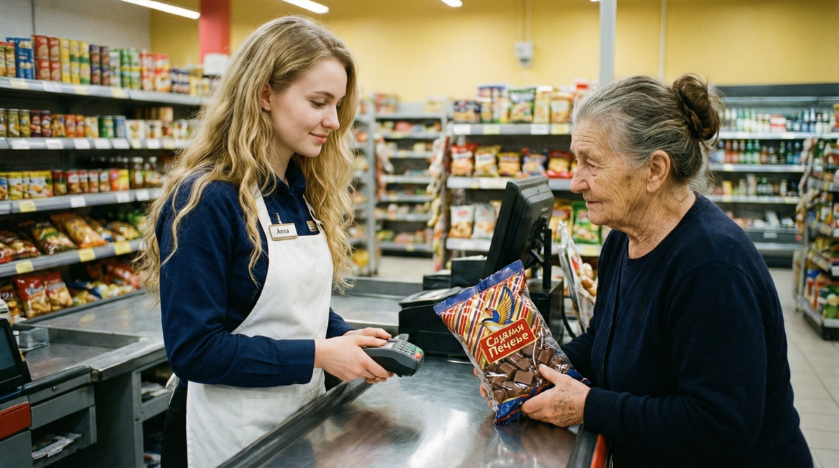 Старушка подошла к прилавку с выпечкой, долго смотрела на печенье в упаковке — «Домашнее сдобное, 149 рублей». Потом достала из кармана кошелёк, расстегнула его дрожащими пальцами и начала пересчитывать мелочь. Монетки звенели тихо, будто стесняясь своей ничтожности.