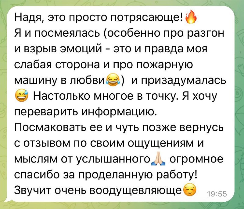 Это уже на 3-и больше, чем я планировала. Ещё 5 счастливчиков в очереди. Я иду на жгучем азарте и интересе. Меня зажигает этот формат, хотя он пока получается не совсем сокращенный, как изначально предполагалось. В среднем на разбор и мою работу уходит также примерно часа 2 +/–. Да и разобраться во всех нюансах – тот еще квест. Более компактными стали трактовки, следовательно объем голосовых. Посмотрите, как стройненько идёт разбор! 🤩 ✨Точечные, меткие, с юмором и любовью пояснения к космическому паспорту. Вместо долгого латте на 3 часа, мои консультации стали крепкими эспрессо примерно на 25-30 минут. Я ещё не выбрала золотую тройку, чьи карты и комментарии буду публиковать в соцсетях. Жду отзывы. Так как очередь итак большая, нагрузка выросла, я заканчиваю аттракцион невиданной щедрости. Тем более вроде бы я делаю акцент на Таро. Но уж очень мне нравятся эти разборы и гороскопы, как на подбор, захватывающие! Поэтому забирайте мой огонь 🔥 ‼️ Стоимость до конца недели 3500₽ (вме