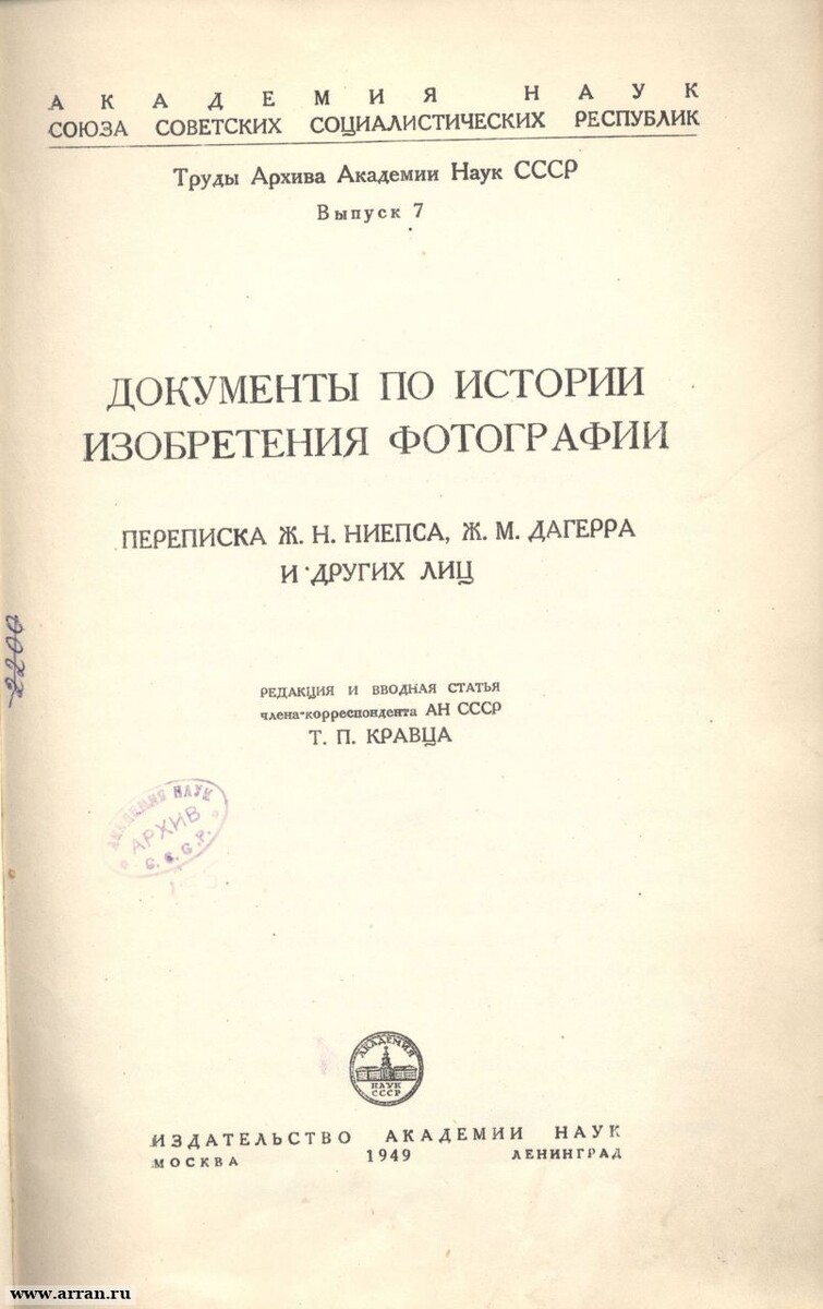 И даже была издана в 1949 году с предисловием академика Вавилова и статьей Князева про поездку российского члена-корреспондента Академии Наук Иосифа Гамеля к Талботу в Лондон и в Париж к Дагеру и сыну Ньепса. Сегодня эту книгу можно найти разве что на сайте архивов РАН, который обновлялся последний раз в 2017 году. Но не все так однозначно с этой книгой, как оказалось. Вот что пишет А.С. Сонин в работе ««История» с историей фотографии», опубликованной в Вестнике РАН в 1999 году: «В 1939 г., в связи с приближавшимся 100-летием открытия фотографии, Архив АН СССР предложил опубликовать письма изобретателей фотографии Н.Ниепса и Ж.Дагерра. 5 мая 1939 г. президент Академии наук академик В.Л.Комаров распорядился издать эту переписку как "Документы по истории изобретения фотографии" в количестве 1200 экземпляров. 28 февраля 1941 г. рукопись была представлена в Редакционно-издательский совет АН (РИСО), который постановил издать книгу в серии "Научное наследство", причем письма публиковать как