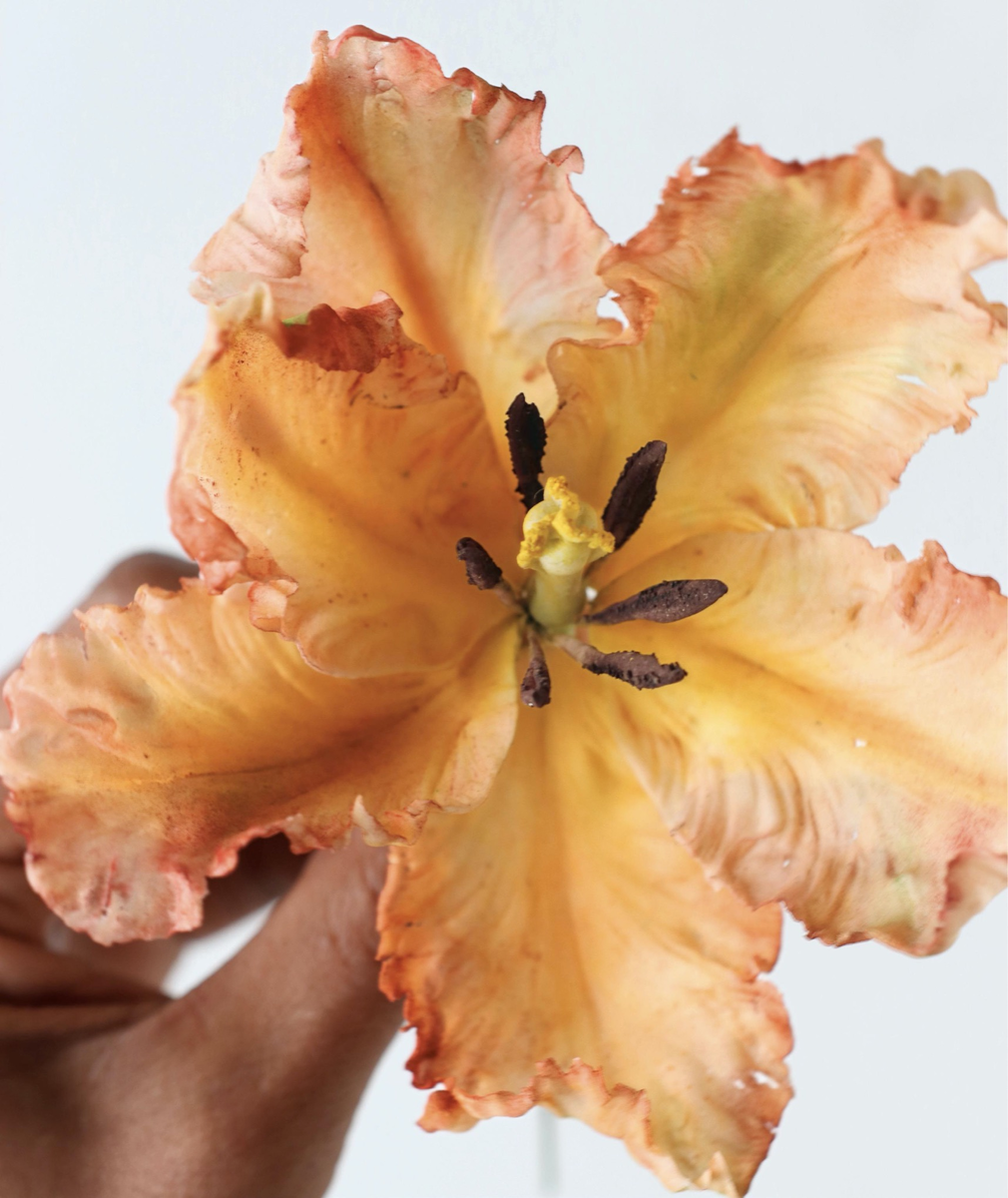 Существует множество видов, которые побуждают экспериментировать с оттенками — занятие, от которого мы никогда не отказываемся. В этом варианте с шестью лепестками у волнистого абрикосового тюльпана нет плавных переходов цвета, но мраморная текстура массы все равно важна, поскольку каждый элемент получается уникальным и не похожим на соседний. Как и в большинстве случаев с сахарными цветами, мы рекомендуем сначала подготовить и полностью высушить серединку, прежде чем переходить к лепесткам и сборке.