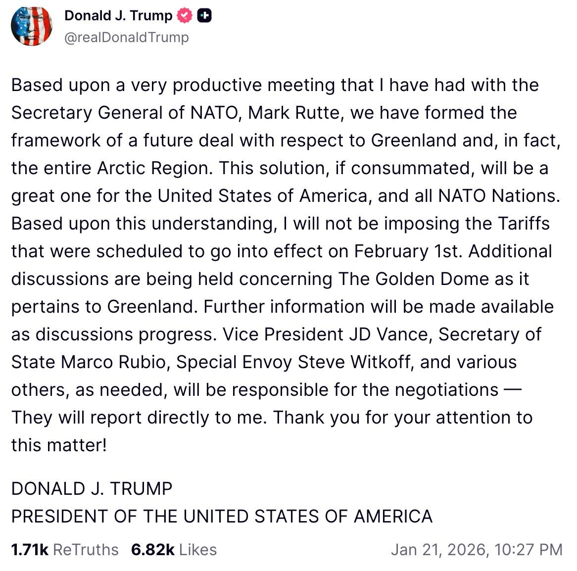 ⚡️ Трамп передумал вводить тарифы в отношении ЕС из-за Гренландии