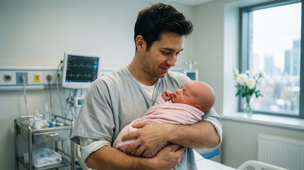 В палате новорождённых — тишина, приглушённый свет, ряды крошечных кроваток. Медсестра бережно поднесла к нему маленькое существо, завёрнутое в белое одеяло с синим бантом.