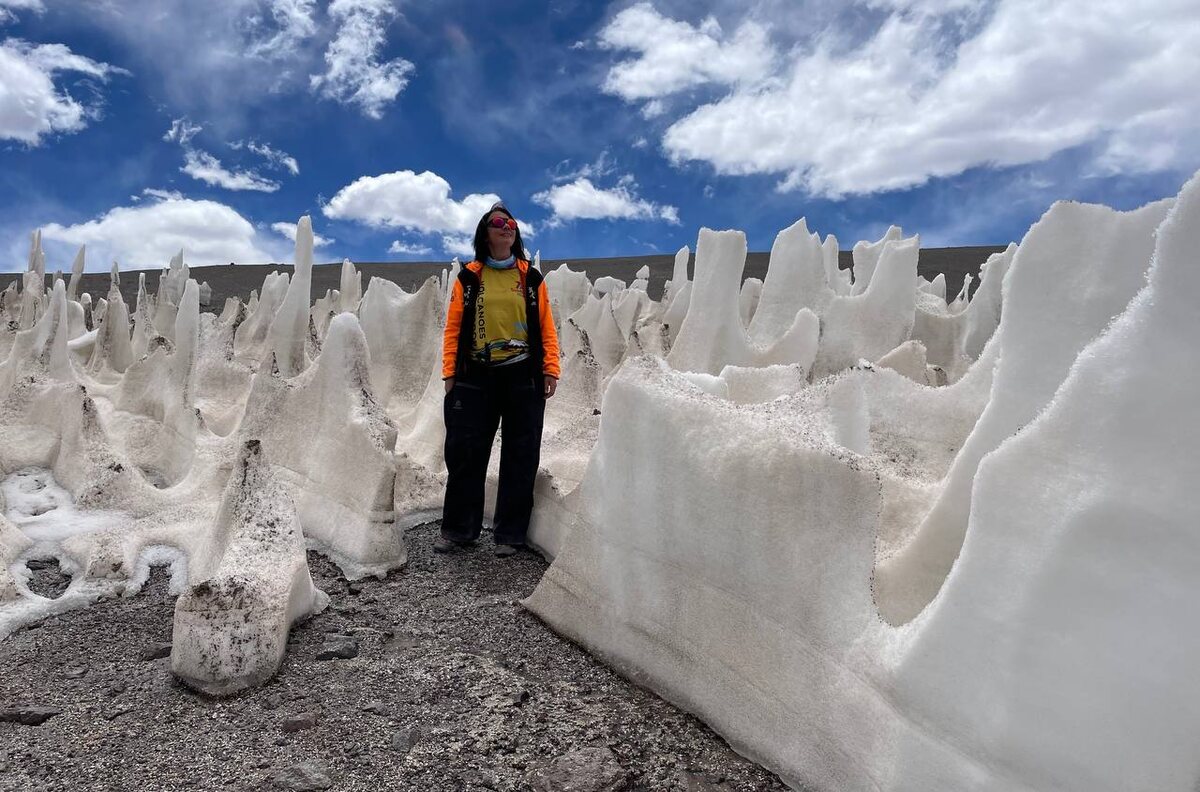 По дороге до лагеря Атакама немного свернули с дороги, чтобы вблизи рассмотреть чудесные создания данных мест – кальгаспоры. Они же – пенитентесы или кающиеся снега. Кающиеся – потому что кому-то они навеяли образ монахов в головных уборах с наклонённой головой. Образуются такие снежные пики в местах с очень сухим воздухом и активным солнцем. Очень красиво и необычно.