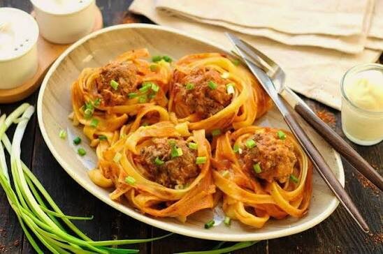 - Разделите лапшу на 4 части, сформируйте «гнёзда» на противне (можно использовать формочки для кексов).