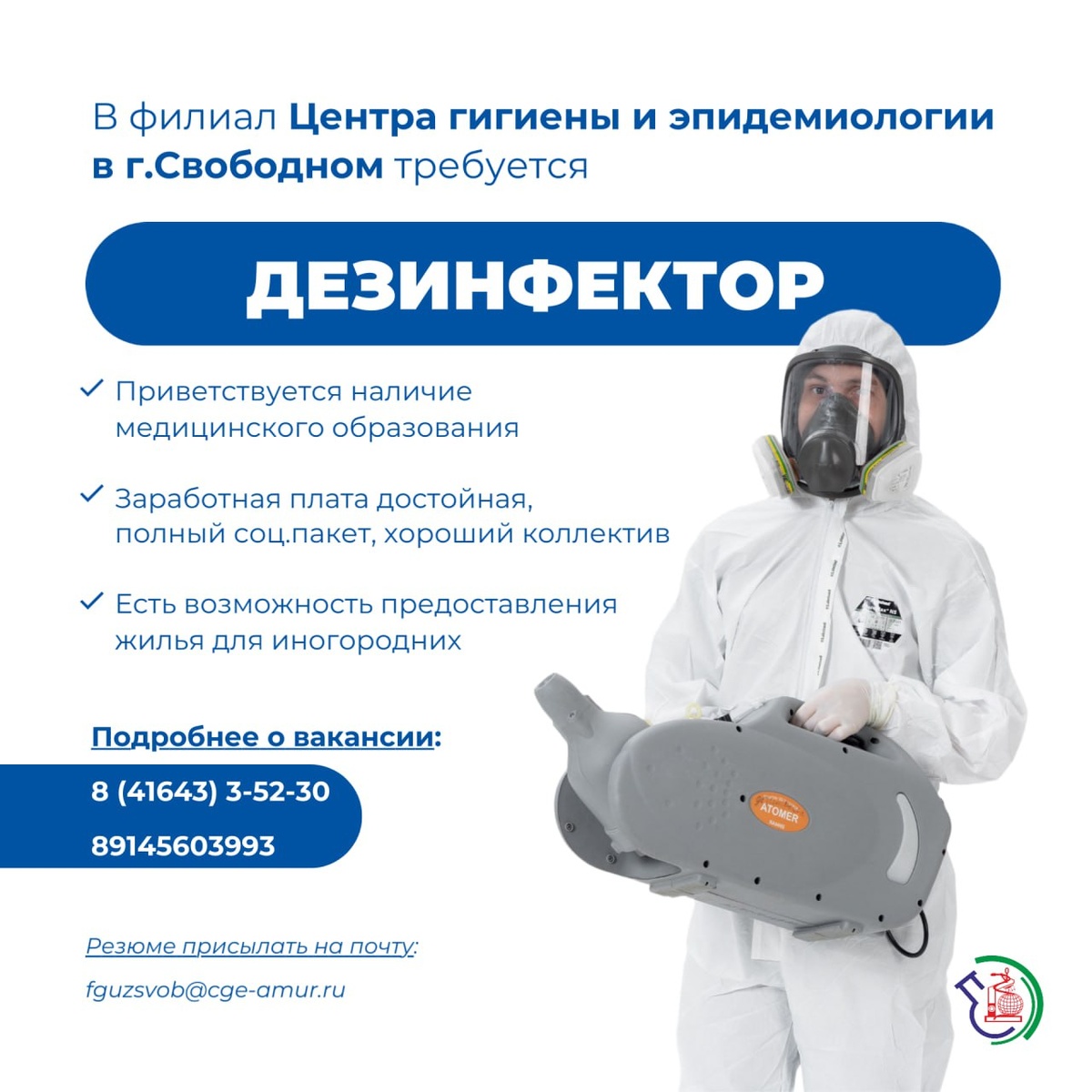 В филиал Центра в г.Свободном требуется дезинфектор 🔘Заработная плата достойная, полный соц.пакет, хороший коллектив 🔘Есть возможность предоставления жилья для иногородних 🔘Приветствуется наличие медицинского образования 📞 Телефон для связи: 8(41643) 3-52-30, 89145603993 📥 Резюме отправлять на эл. адрес: fguzsvob@cge-amur.ru