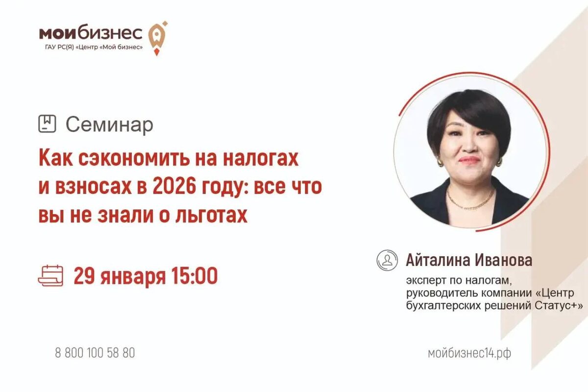 льготах» 🌟Программа: - Новые правила и льготы 2026 года. - Легальные способы снижения налоговой нагрузки. - Ответы на вопросы. 📆Дата: 29 января ⏰Время: 15:00 — 16:00 🎙Спикер: Айталина Иванова, кандидат экономических наук, доцент, аудитор, эксперт по налогам и руководитель бухгалтерской компании «Центр бухгалтерских решений Статус+» 📍Адрес: г. Якутск, ул. Кирова 18 блок Б, конференц-зал 🔗Ссылка для регистрации: https://forms.yandex.ru/cloud/69707e74f47e73b88e544c3e Мероприятие проводится по национальному проекту «Эффективная и конкурентная экономика». 📲Напоминаем, что канал Центра "Мой бизнес" запущен в МАХе. Подпишитесь, чтобы оставаться в курсе последних новостей! @moibizsakha