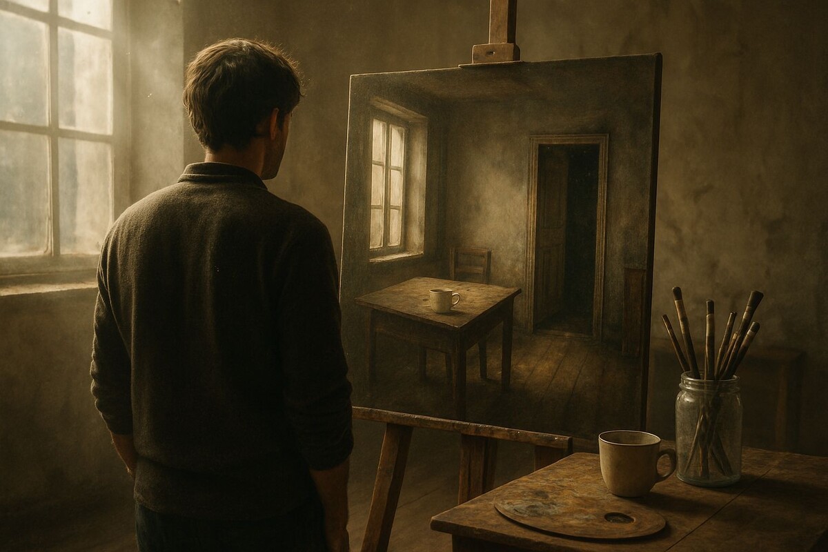 Неделю он писал эту кухню. Не интерьер, а миг. Холодный утренний свет, ломающийся о край фарфоровой чашки. Молоко в кофе не размешано, мутным облаком застыло у края. Газета — кроссворд не дописан, ручка лежит сверху. И эта щель в дверном проёме, тонкая полоска серого утра, за которой — пустота.