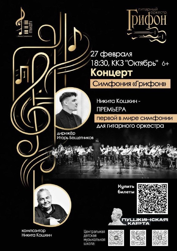 ! Дорогие друзья! Приглашаем вас стать свидетелями уникального события в мире академической музыки - 27 февраля в Южно-Сахалинске состоится концерт «Симфония «Грифон», где прозвучит первая в истории культуры симфония для гитарного оркестра. На премьере ожидается присутствие автора - всемирно известного композитора и гитариста Никиты Кошкина. Под руководством дирижёра Игоря Бещетникова музыканты Гитарного оркестра «Грифон» Центральной детской музыкальной школы подарят слушателям всю глубину гитарного звучания, в сопровождении группы мандолин, виолончели, флейты и перкуссии. 📅 27 февраля в 18:30 📍 ККЗ «Октябрь» 🎟 Приобретайте билеты заранее: https://cultsakhalin.ru/events/21174/koncert-simfoniya-grifon Возможна оплата Пушкинской картой! Этот вечер обещает стать ярким событием в культурной жизни Сахалинской области. Станьте частью мировой музыкальной истории! @cdmshsakhalin