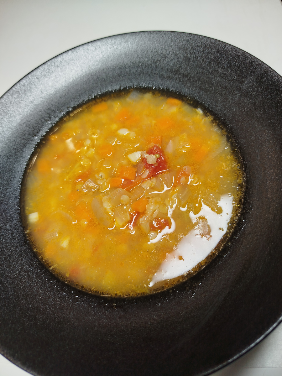 Красную чечевицу заливаем водой и варим 10 минут. На сковороде отдельно пассируем лук, морковь и корень сельдерея. Когда овощи станут мягкими, добавить томаты и тушить 5 минут. Соединить все это с чечевицей. В самом конце когда уже выключен огонь, добавить радавленный зубчик чеснока и столовую ложку оливкового масла.