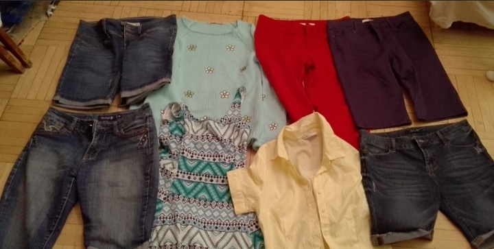Шорты успела поносить по разу, джинсы (красные на фото) несколько месяцев до наступления холодов, свитер красный думала на Новый год подойдет, но так и не надевался. Остальное лежит, чего-то ждёт.