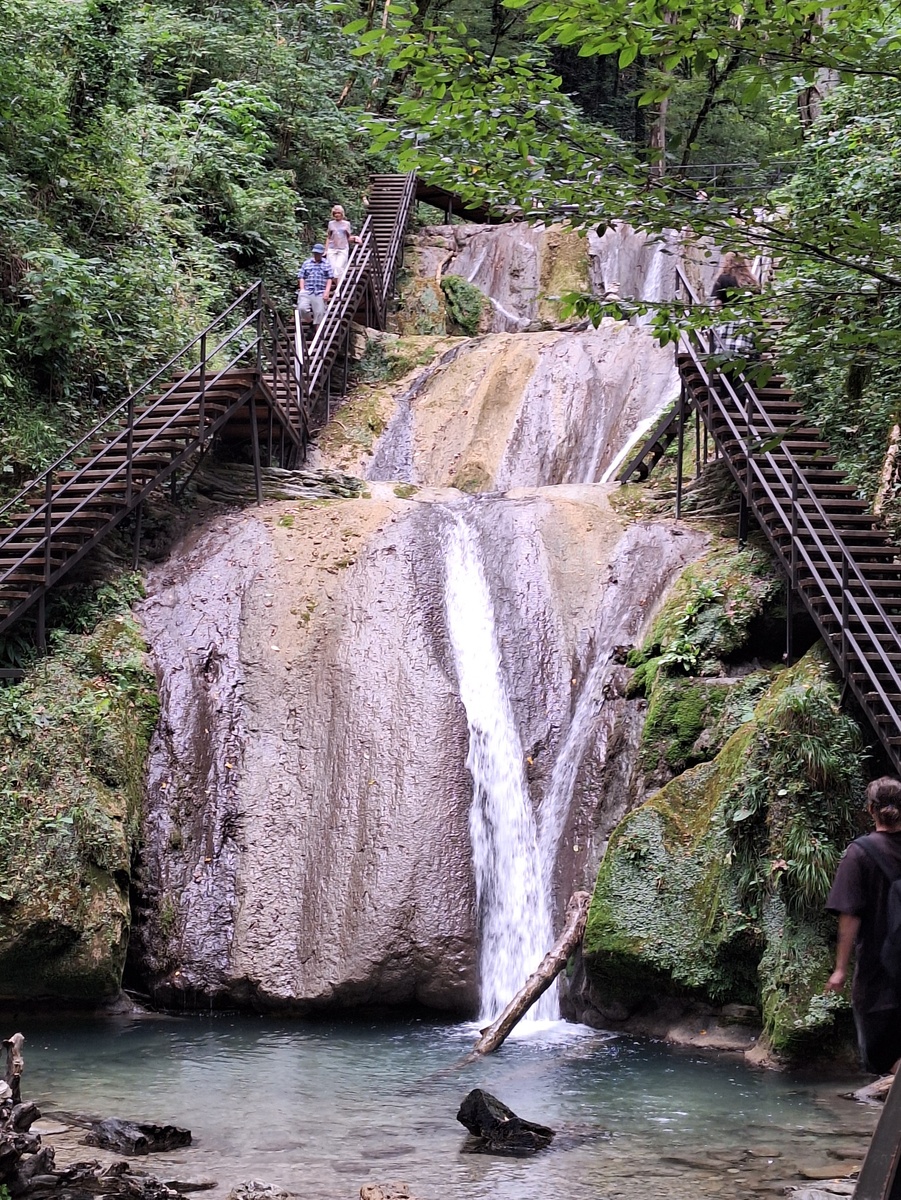 Рассматривая список экскурсий на листовке, я выбирала куда бы поехать, чтобы посмотреть что-то интересное. Продавец предложила съездить на водопады, в которой кроме водопадов, мне обещали по пути заехать на дегустацию сыров, вина и чая, и вот я еду на "33 водопада". 33 водопада - это обустроенная экологическая тропа в Сочинском национальном парке вдоль горного ручья Джегош, подойдёт для любого возраста, главное быть готовым к ступенькам. Тропа находится между Дагомысом и Лазаревским, выше аула Большой Кичмай вдоль по руслу реки Шахе. Можно доехать на собственном автомобиле до начала тропы или добраться до Головинки (автобусы 76, 77 со стороны Сочи или на электричке до станции Головинка), потом в Головинке пересесть на автобус 158 до аула. От аула дальше либо пройти пешком несколько километров, либо ловить попутку или договориться Я же ехала с группой из Дагомыса. Дорога заняла больше часа. Полпути неспешное движение по побережью через посёлки, с пробками и сбором всех участников, то н
