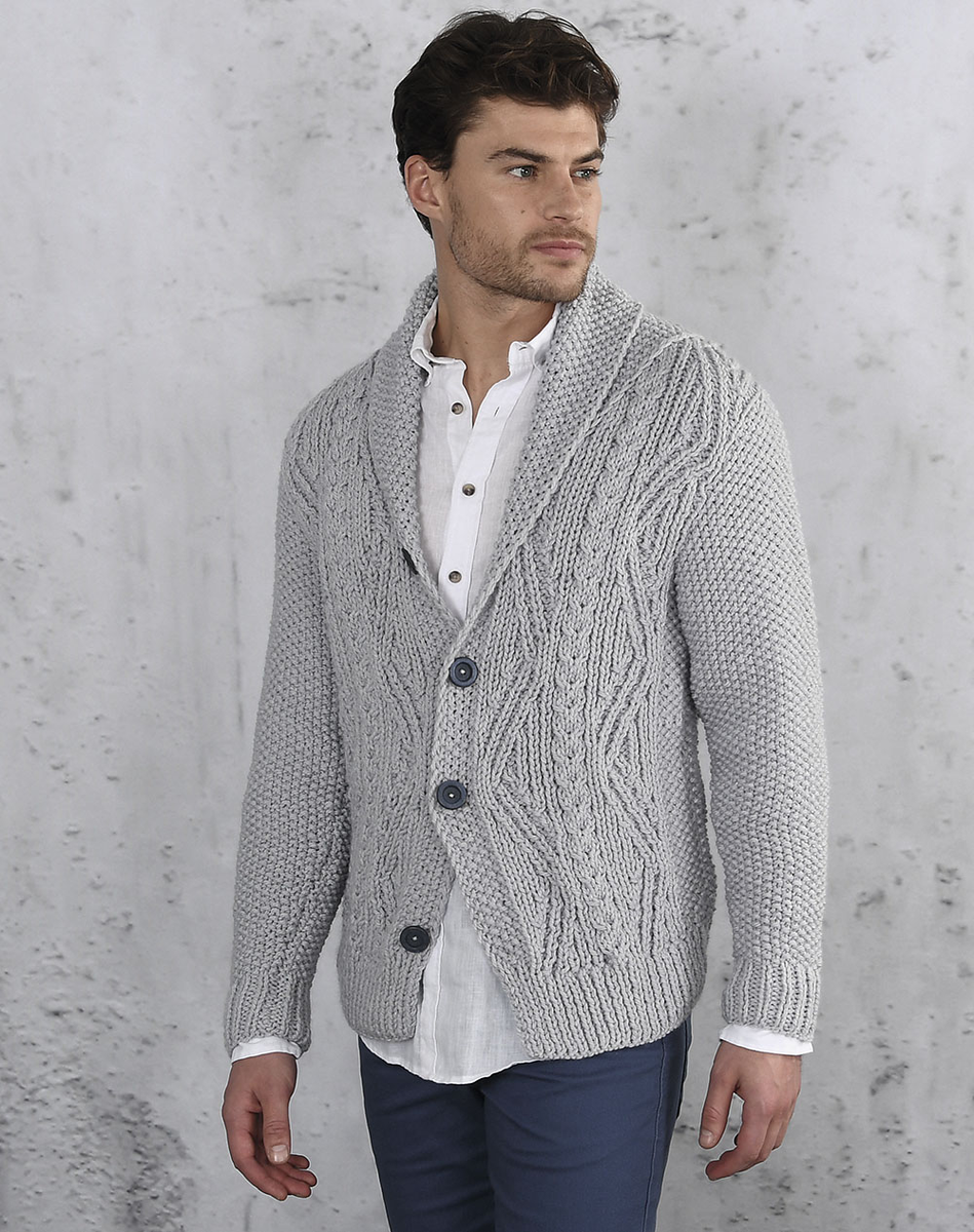 Размеры S (M) L (XL) Пряжа Plassard Leader (100% акрила; 118 м/ 100 г) — 7 (8) 9 (10) мотков светло-серой (№ 11); спицы № 6 и 6,5; 1 вспомогательная спица; 4 пуговицы. Вязать попеременно 1 лицевую, 1 изнаночную. Из протяжки вывязать 1 лиц. скрещенную петлю. 1-й р.: * 1 лиц., 1 изн., от * повторять.