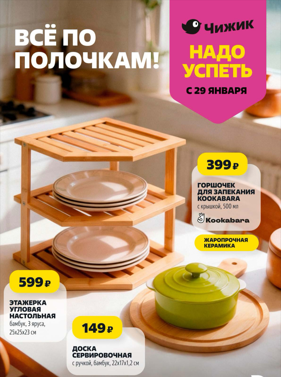 Бамбуковая доска с намёком на сервировку в японском стиле, штабелируемый контейнер для идеального порядка и сковорода, которая обещает стать верной соратницей на каждой плите. А угловая этажерка — это архитектурное решение для захламлённого стола, дарящее ему три яруса свободы.