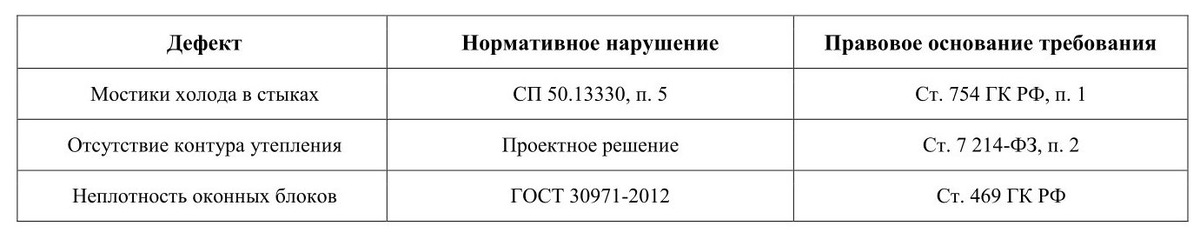 Юридический аспект: Выявление несоответствия фактических теплозащитных характеристик нормативным требованиям является основанием для предъявления требований по ст. 7 Федерального закона №214-ФЗ и ст. 754 Гражданского кодекса РФ о ненадлежащем качестве работ.