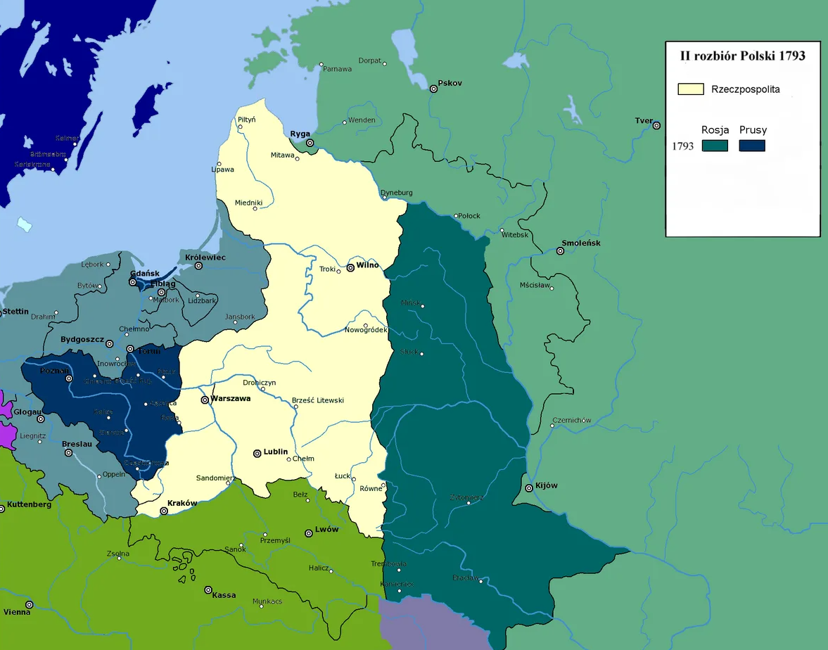Второй раздел Речи Посполитой в 1793 году — один из самых циничных актов в истории европейской дипломатии. Если Первый раздел (1772) ещё можно было оправдать в глазах мира «анахронизмом» польского устройства и угрозой «анархии», то Второй был чистым наказанием. Наказанием за попытку стать нормальным, сильным государством. Он последовал менее чем через год после короткой русско-польской войны 1792 года, которую Россия начала именно для того, чтобы свергнуть польское правительство, принявшее Конституцию 3 мая. Итогом стал не просто очередной отъём земель, а сознательное умерщвление политического субъекта. Речь Посполитая после 1793 года перестала быть даже подобием независимой страны — она превратилась в резервацию, полностью контролируемую из Петербурга. Поводом для раздела формально послужило «распространение якобинской заразы» — отсылка к Французской революции. Но реальная причина была проще и грубее. Конституция 3 мая 1791 года, установившая наследственную монархию и отменившая губит