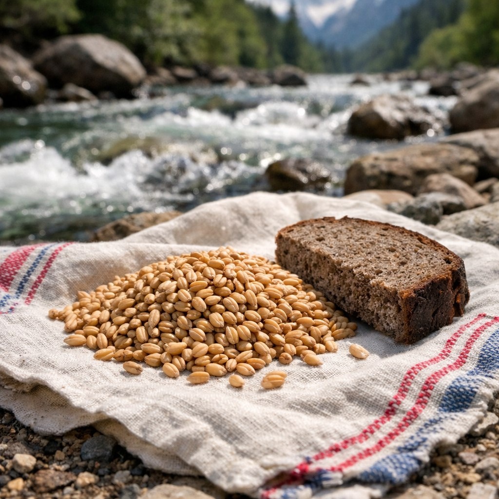 Они подошли к реке. Прозрачная, ледяная, неглубокая, но быстрая река шумела далеко вокруг. Мужчина развернул платок, где лежал хлеб и горсть зерна.