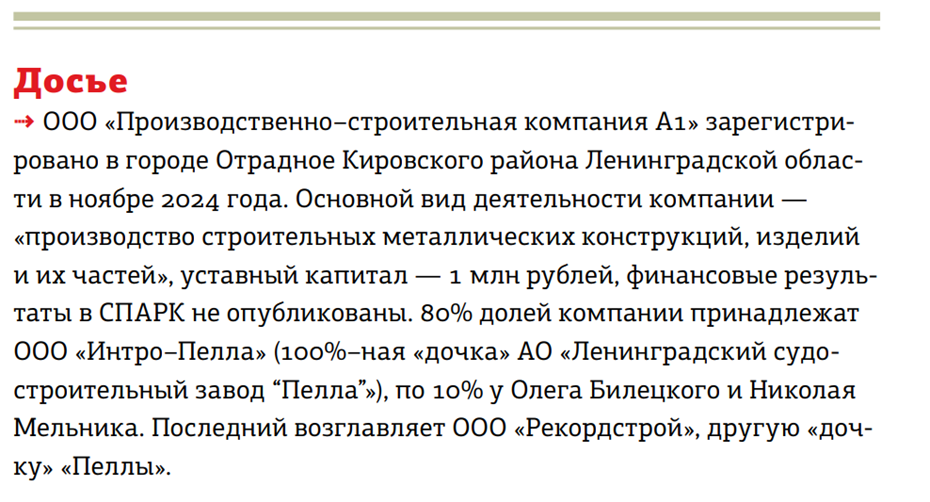 По его словам, ПСК–А1 занимается общестроительными работами в сфере судостроения и выполняет примерно такие же отделочные работы, как и “Рекордстрой”. "Поэтому там фигурирует директор “Рекордстроя” Николай Мельник", — уточнил руководитель "Пеллы".