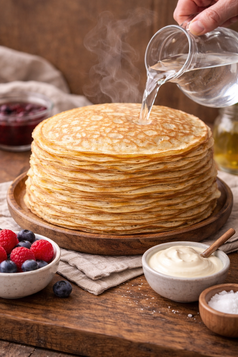 Этот рецепт выручает всегда: когда нет молока, когда нужен бюджетный вариант или когда хочется максимально лёгких блинов без лишней жирности. Несмотря на простой состав, блины получаются тонкими, мягкими и отлично подходят как для сладких, так и для солёных начинок.