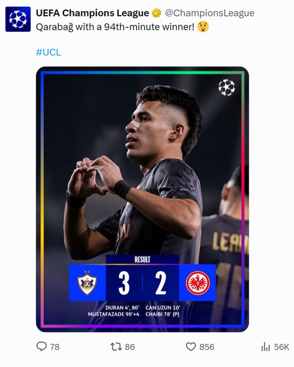 ⚽️ На официальной странице Лиги чемпионов УЕФА размещена публикация о победе "Карабаха".