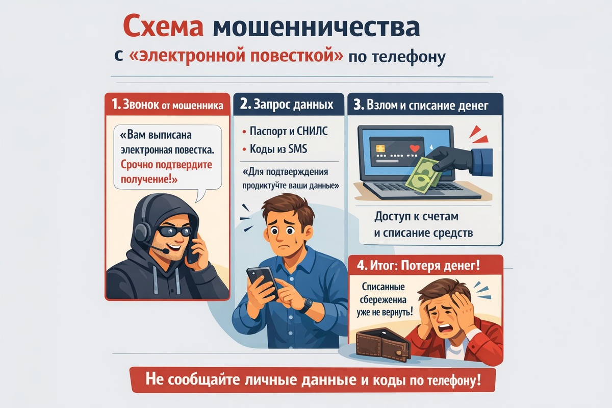 К сожалению, мошенники активно используют тему электронных повесток, чтобы обманывать людей. Вот как обычно выглядит эта схема: 1. Звонок от «официального лица»: Мошенник представляется сотрудником военкомата, полиции, суда или «министерства цифрового развития». Часто звонок идёт с подменённого номера (например, отображается номер реального госучреждения). 2. Сообщение о проблеме: Вам говорят, что на ваше имя пришла электронная повестка (или иное уведомление), но вы её не получили, не просмотрели или не подтвердили. Вас могут обвинить в уклонении. 3. Создание срочности и страха: Злоумышленник создаёт ощущение чрезвычайной ситуации: «Если не решите вопрос сейчас, будет штраф / арест / блокировка счетов / приезд полиции». 4. Перевод на «технического специалиста» или «помощника»: Чтобы «решить проблему», вас соединят с другим мошенником, который будет говорить о необходимости: