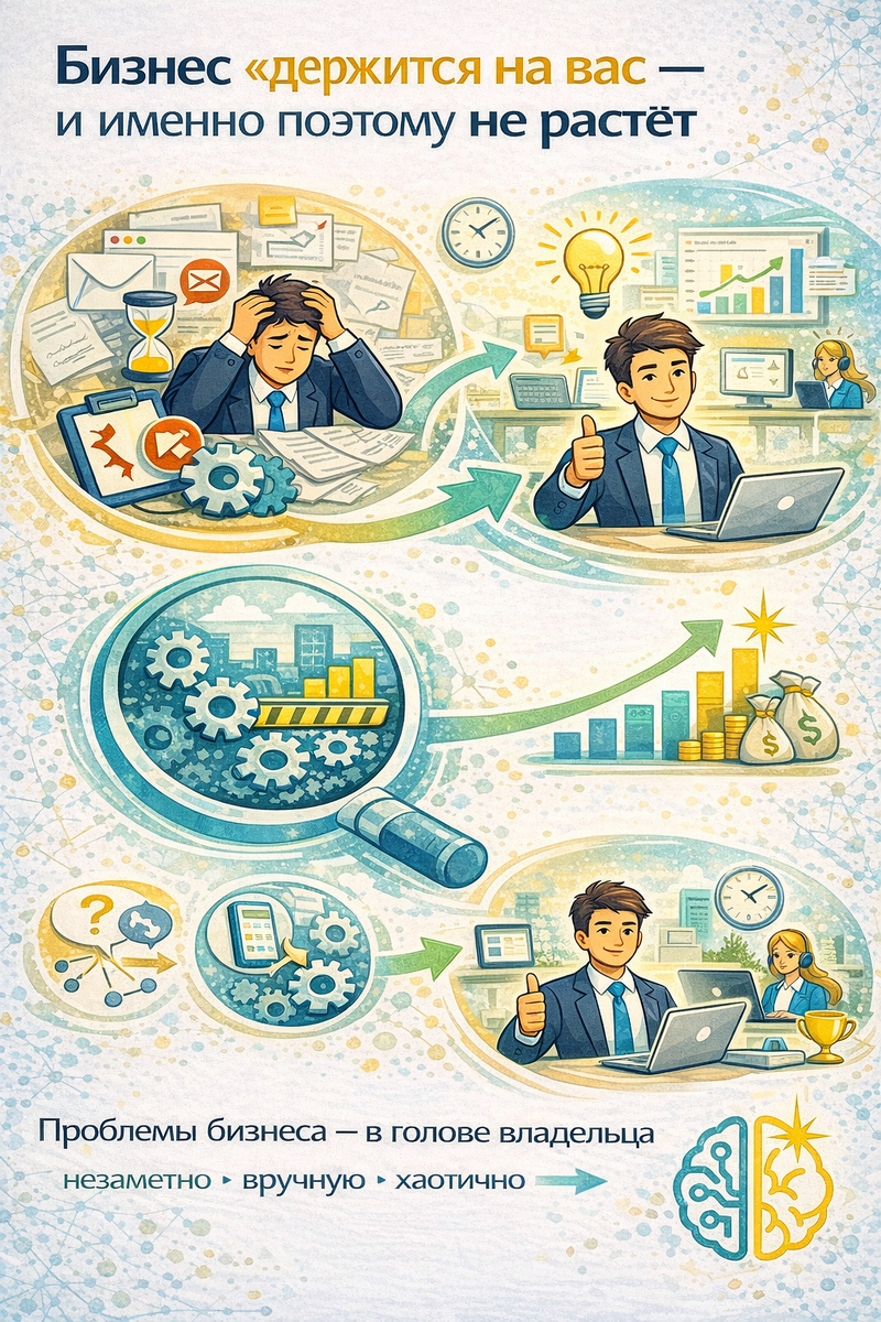 На самом деле — это симптом неоформленной системы. Когда бизнес только начинается, это нормально: Но со временем происходит незаметная подмена: владелец перестаёт строить систему и начинает быть системой. Вы: Бизнес к этому адаптируется.