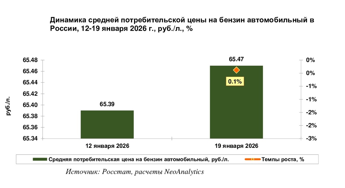 В ходе ежемесячного мониторинга розничных (потребительских) цен на бензин автомобильный и дизельное топливо, проведенного NeoAnalytics, выяснилось, что средние потребительские цены на бензин автомобильный и дизельное топливо на 19 января 2026 г. увеличились незначительно по сравнению с аналогичными показателями за 12 января 2026 г. Объектом исследования являются средние потребительские цены на бензин автомобильный и дизельное топливо в России, руб. за литр. За период с 12 по 19 января 2026 г. рост цен на бензин автомобильный был зафиксирован в 53 субъектах Российской Федерации, более всего в Ивановской области +0,9%. Снижение цен на бензин автомобильный было отмечено в 14 субъектах Российской Федерации, более всего в Иркутской области (-2,4%). В Москве и Санкт-Петербурге за прошедший период изменение цен на бензин автомобильный составило +0,3% и +0,1% соответственно. Таким образом, средняя потребительская цена на бензин автомобильный на 19 января 2026 г. в России выросла за неделю на 0