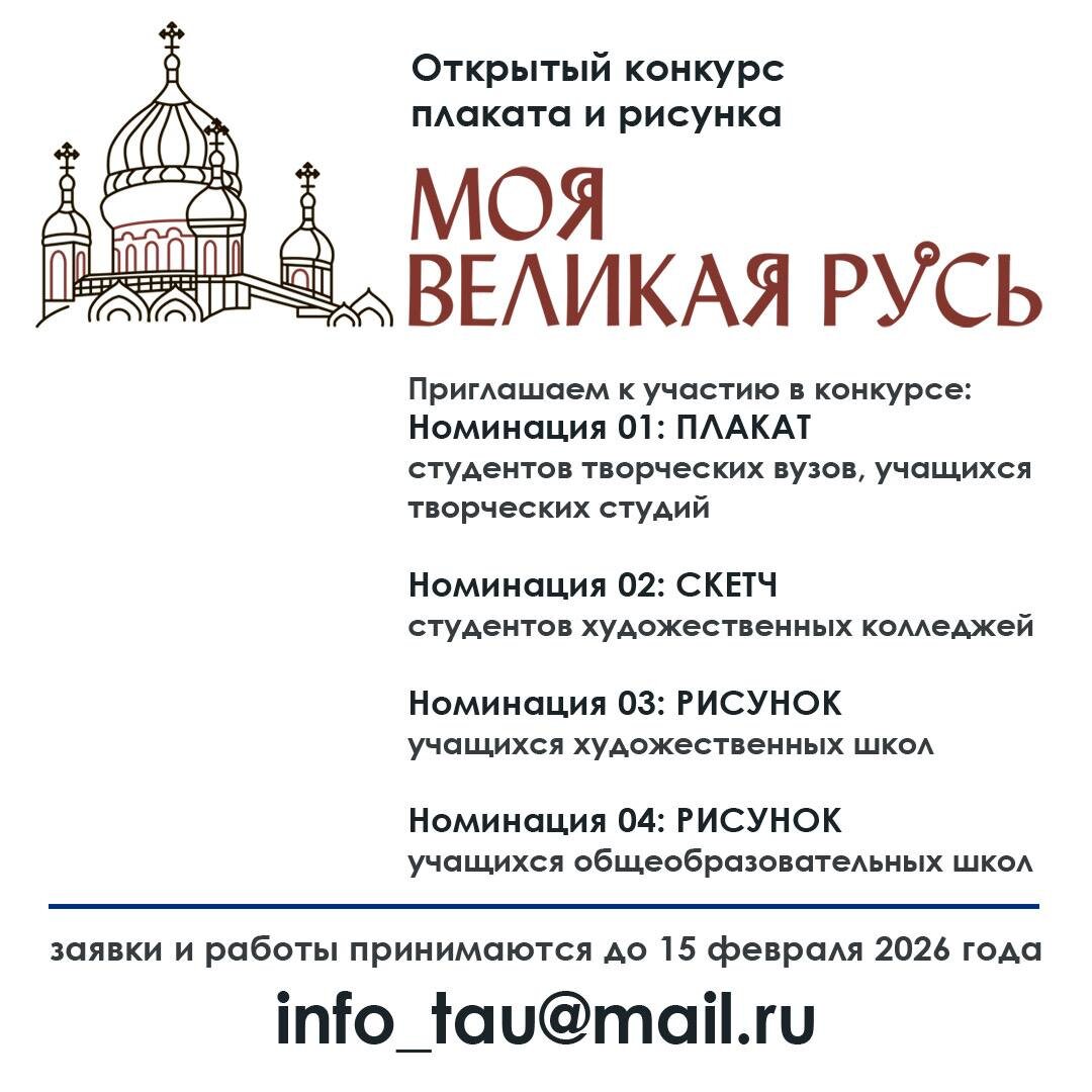 Кафедра дизайна Тольяттинской академии управления объявляет о старте Открытого конкурса плаката и рисунка «Моя великая Русь». К участию приглашаются (бесплатно): Требования к работам: Как принять участие? До 15 февраля (включительно) отправьте на info_tau@mail.ru : Контактное лицо: Татьяна Анатольевна Самсонова, руководитель Лаборатории цифрового дизайна. Положение о конкурсе, шаблоны заявки и согласия на обработку персональных данных по ссылке