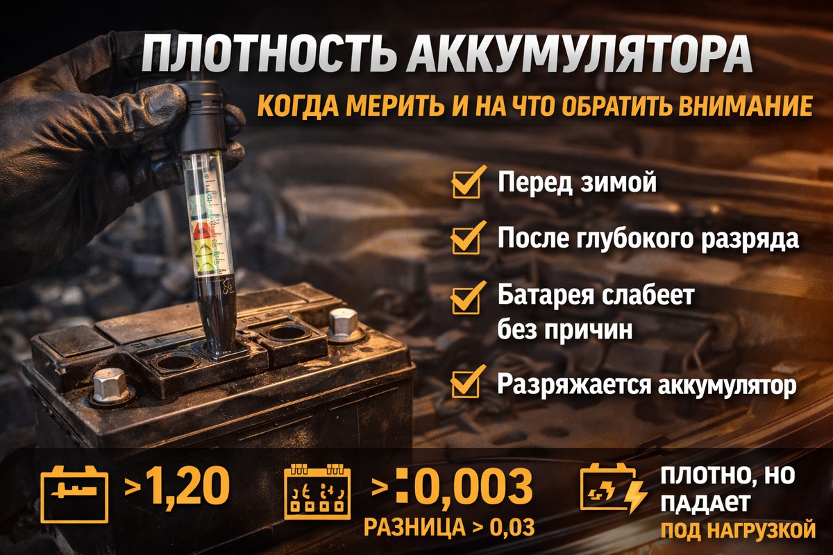 - Плотность помогает отличить недозаряд от износа и понять, когда замена аккумулятора действительно оправдана
