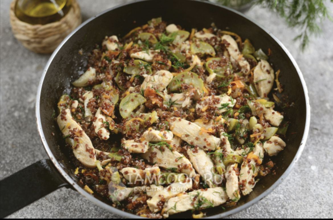 - Сборка блюда: Подготовленную курочку нарезайте ломтиками, выложите поверх киноа и добавьте обжаренные овощи сверху. Можно украсить свежей зеленью и добавить немного лимонного сока перед подачей.
