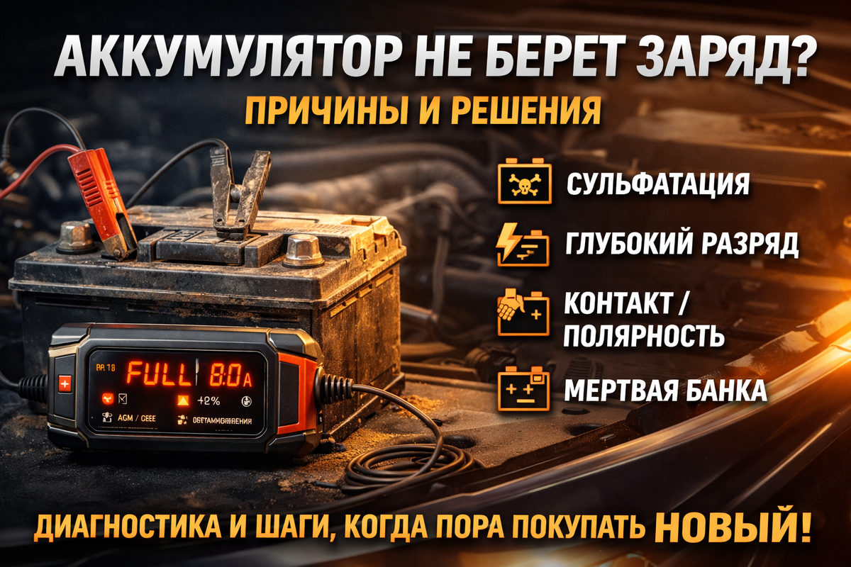 - Аккумулятор не берет заряд из-за: сульфатации, глубокого разряда, плохого контакта, неправильного режима (AGM/GEL/литий), мертвой банки (коротыш), проблем с электролитом, температуры.