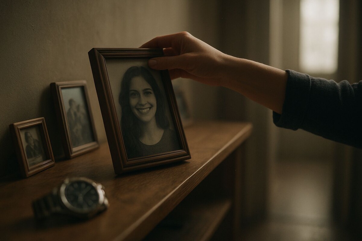 На полке её фотографии ловили первый утренний свет. Она поправила рамку, чтобы та стояла ровнее.