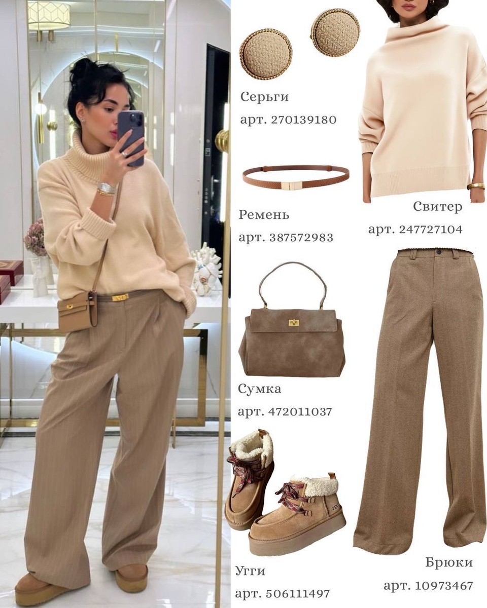 Нежный образ в светлой гамме — идеальный вариант для спокойных зимних дней. Мягкий свитер с высоким горлом создаёт ощущение тепла и уюта, а прямые бежевые брюки добавляют аккуратность и визуально вытягивают силуэт. Угги и сумка в тон поддерживают общую палитру, а лаконичные серьги и тонкий ремень делают образ завершённым.