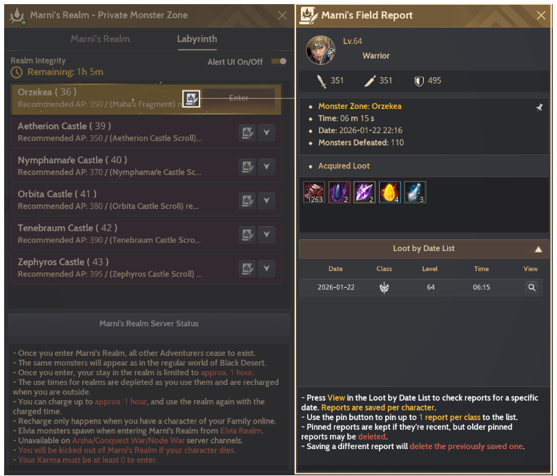 Мы добавляем функцию «Отчёт о полевых испытаниях Марни», чтобы помочь искателям приключений отслеживать и анализировать данные о своих боях. При входе в Царство Марни система автоматически запишет время, проведённое в локации, и полученную добычу без каких-либо дополнительных действий.