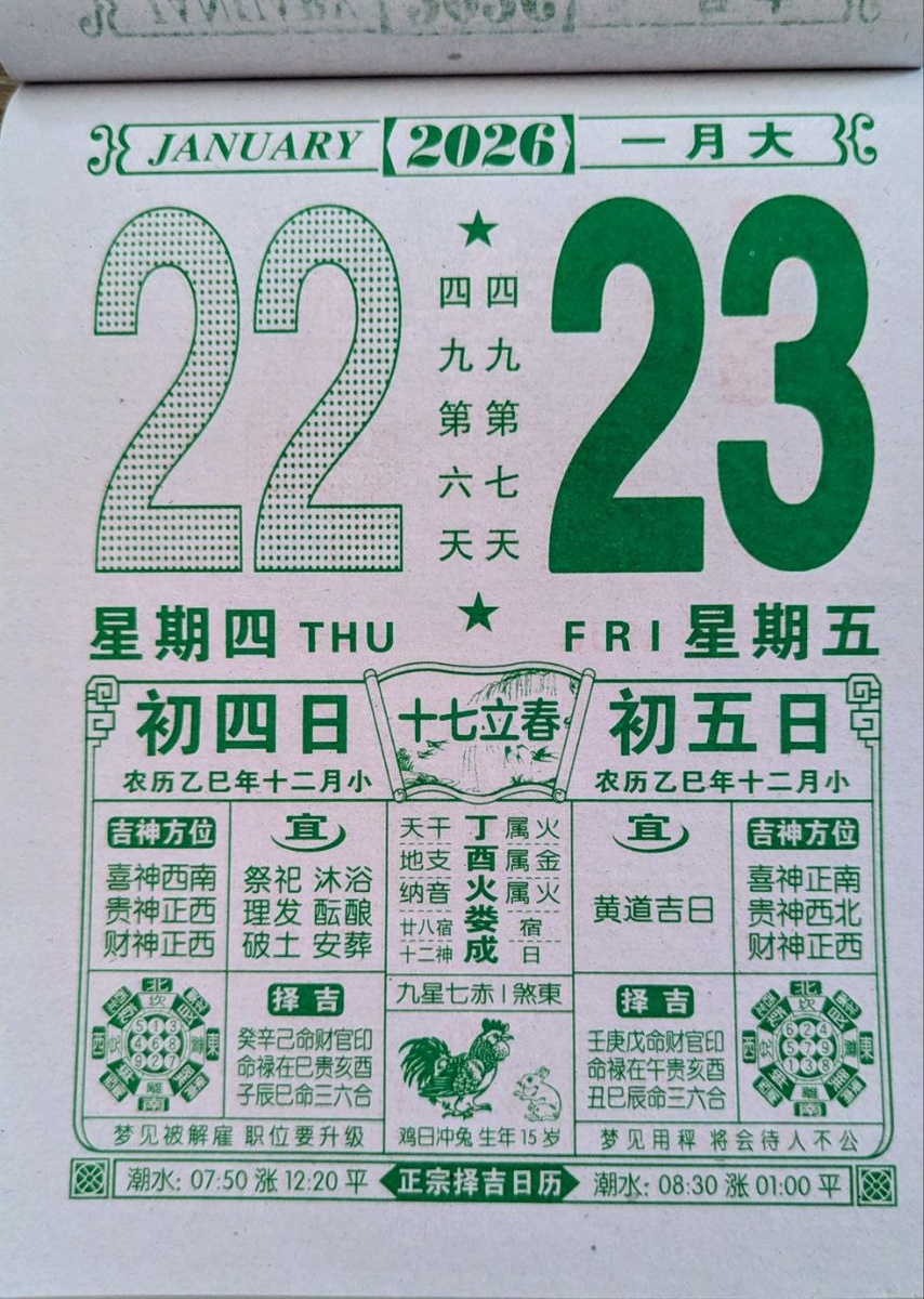 На стене висит отрывной китайский календарь – источник мудрости, а также бодрости 22 января 2026 года, четверг Лунный календарь: 4-й день 12-го лунного месяца Циклическая дата (干支): день Дин-Ю (丁酉) Знак года: Змея Солнечный термин: начало весны (立春) Активная звезда дня: 7-я алая звезда, направление – восток День считается умеренно благоприятным и подходит для ритуальных и личных действий: очищения, омовения, ухода за собой, стрижки, а также для решения бытовых вопросов. Допустимы спокойные завершения и прощания с устаревшим. Активная 7-я алая звезда усиливает импульсивность и резкие слова, поэтому важно контролировать эмоции и избегать конфликтов. Направления удачи: бог радости – юго-запад, бог помощи и поддержки – запад, бог денег – запад. Сны, в которых удаётся снять обвинения, оправдаться или освободиться от давления, указывают на скорое разрешение напряжённой ситуации и рост профессионального статуса. Символ дня: Петух и Кролик. Петух символизирует прямоту и демонстративность, Кр
