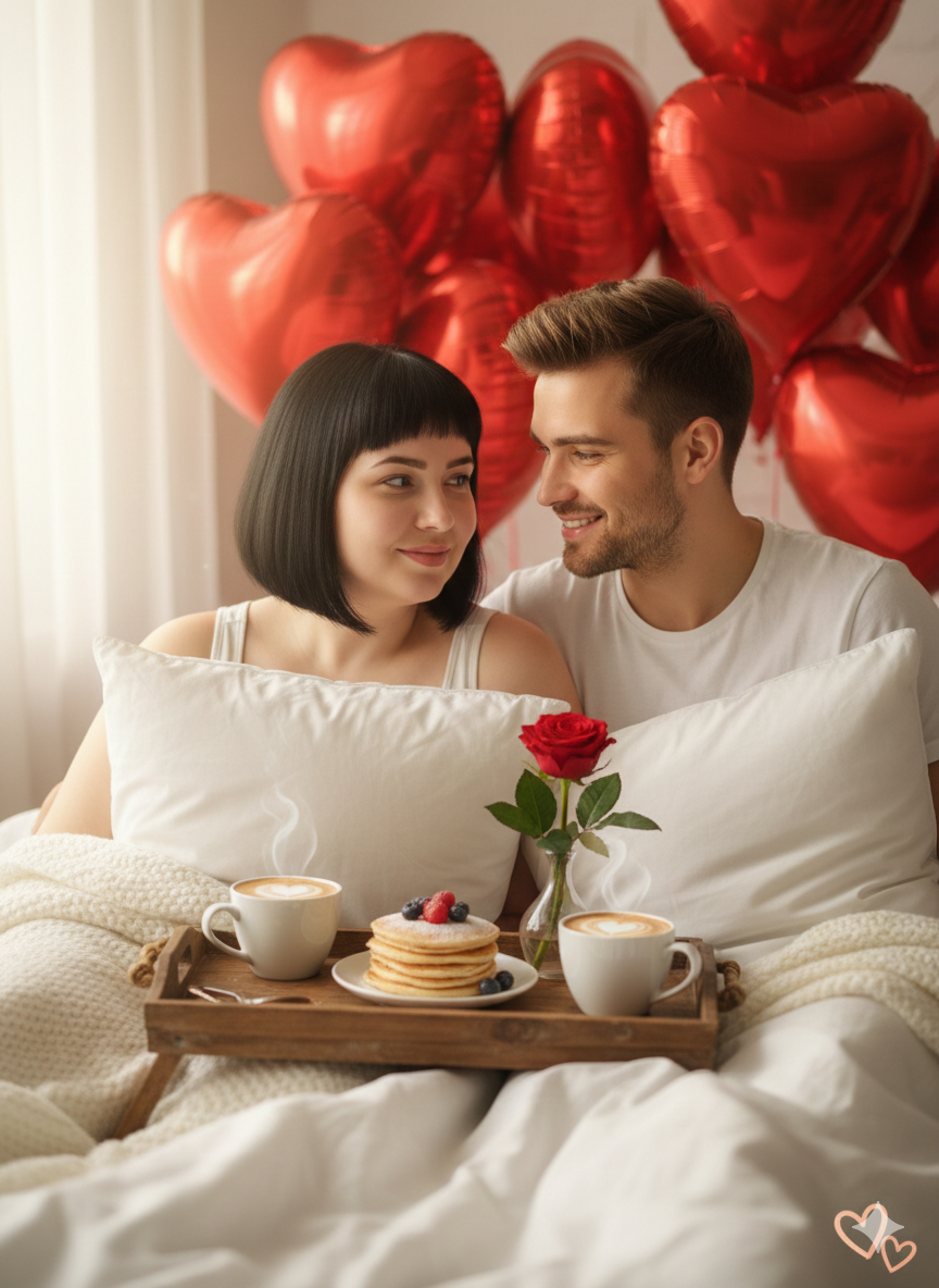 A hyper-realistic professional studio photo, Pinterest aesthetic. A romantic couple enjoying a cozy Valentine's Day morning on a plush bed with crisp white linens. Wooden breakfast tray with coffee and heart-shaped pancakes. Background: blurred red heart foil balloons. Soft natural morning light. ☕️❤️