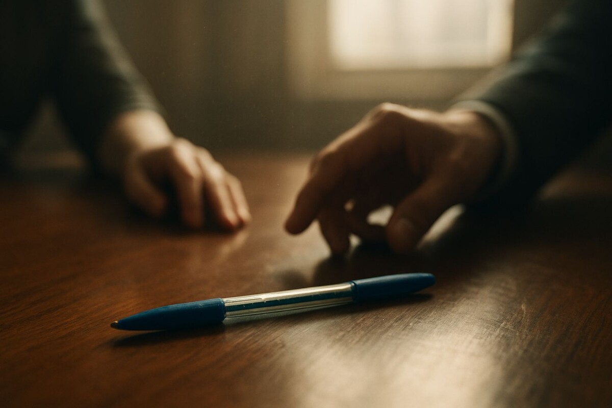 И тогда, слева от него, возникло движение. Елена, не поднимая глаз от своего блокнота, выдвинула ящик стола. Достала оттуда нераспакованную ручку. Такую же дешёвую, с синим стержнем. Положила её на стол перед Алексеем и тихо подтолкнула в его сторону. Пластик скользнул по лакированной поверхности с едва слышным шуршанием.