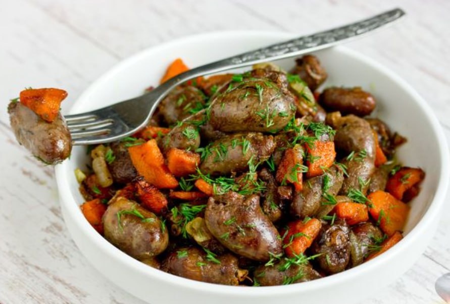 : 🤩много белка - около 25–30 г на 100 г 🤩витамин В12 - защищает нервную систему 🤩Коэнзим Q10 - в нашем сердце его тоже много, но нет нет да и маловато случается)) Куриные сердечки с луком и морковью 🤩Куриные сердечки - 500 г 🟢Лук репчатый - 100 г (1 шт.) 🤩Морковь - 100 г (1 шт.) 🟢Травы итальянские сушёные - 1 ч. ложка 🤩Соль - по вкусу 🟢Перец чёрный молотый - по вкусу 🤩Вода (кипяток) - 100 мл 🟢Масло подсолнечное - 30 мл (2 ст. ложки) 🤩Укроп свежий (для подачи) - несколько веточек 1. Лук и морковь очистите и промойте. 2. Куриные сердечки промойте, обсушите с помощью бумажного полотенца, затем срежьте с каждого сердечка лишний жир и сосуды. 3. Морковь нарежьте средними четверинками кружочков или некрупными кусочками. 4. Лук нарежьте полукольцами. 5. В сковороде разогрейте подсолнечное масло и обжарьте в нём лук с морковью в течение 3 минут на сильном огне, часто помешивая. 6. Обжаренные овощи переложите в мисочку, а в сквороду выложите куриные сердечки. 7. На сильном