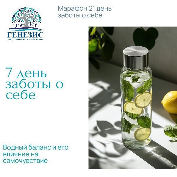 День 7. Источник внутри: как водный баланс наполняет нас жизнью Добрый день, дорогие участники! 💧 Первую неделю нашего марафона мы посвятили основам заботливого диалога с собой: через сон, питание и движение. Сегодня мы обратим внимание на самую простую, базовую и часто упускаемую из виду потребность нашего тела — чистую воду. Вода — это больше, чем просто жидкость. Это метафора самого ресурса: когда ее достаточно, мы текучи, адаптивны, ясны. Когда ее мало, мы чувствуем «засуху» на всех уровнях: туман в голове, раздражительность, усталость. Почему забота о водном балансе — это акт любви к себе? Ясность ума: Даже легкое обезвоживание снижает концентрацию, увеличивает тревожность и утомляемость. Вода — это «смазка» для нашего мозга. Управление эмоциями: Жажда часто маскируется под голод или нервное напряжение. Достаточное питье помогает нам лучше распознавать свои истинные чувства и реагировать на них осознанно. Здоровье тела: Вода участвует в каждом процессе: от пищеварения и ре