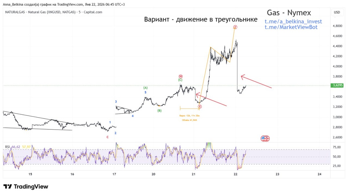На котировках Capital.com, которые я использую для разметки газа Nymex, идут манипуляции второй день, что оказывает существенное влияние на разметку. На фьючерсах Nymex таких манипуляций нет, экстремумы там совершенно другие и с низов можно вести импульс. Поскольку основная гипотеза - это рост в КД в следующей третьей волне [3] of c of (b), то с низов 16 января нужен зигзаг. Т.о., с низов пятницы идет либо незавершенный импульс (A) of [3] of c of (b), либо (B) поставили вчера боковой коррекцией и сейчас состоялся выход в (С) of [3] of c of (b) [по нотации разметки Moex]. Не является ИИР 💪 БОЛЬШЕ разметок в Закрытом канале: Бот Закрытого Канала, доступен Пробный Период! (подписаться из-за границы, пишите личным сообщением)