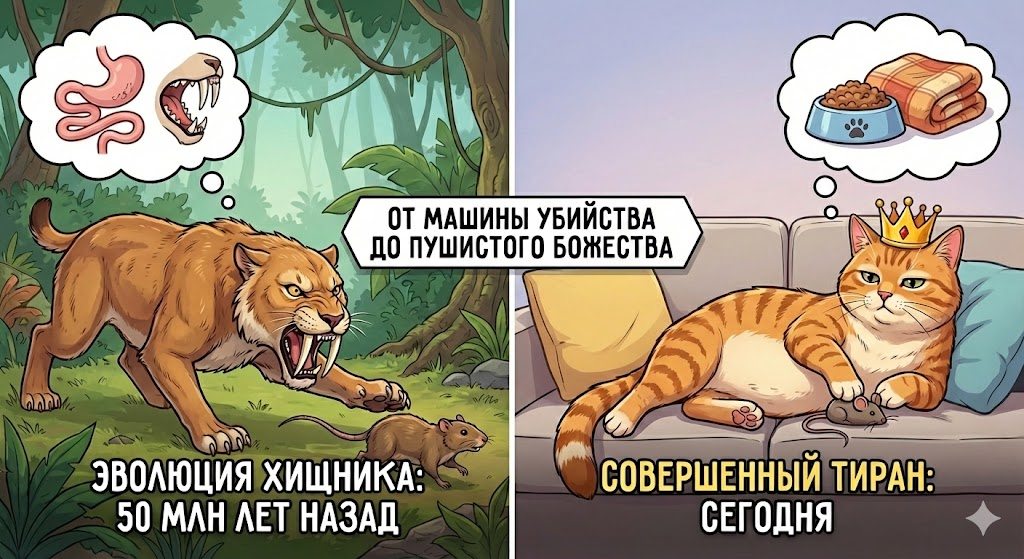 Знаешь, в этом и есть вся ирония. Мы приручили (хотя кто кого приручил - вопрос открытый) существо, которое 50 миллионов лет затачивалось под убийство всего живого. Мы пускаем его под одеяло, греем ему лапки и покупаем паштеты с кроликом, забывая, что его предки смотрели, как вымирают саблезубые тигры, и даже не моргали. Кошки - это единственные хищники, которые смогли сохранить свою дикую суть, уютно устроившись в наших квартирах.