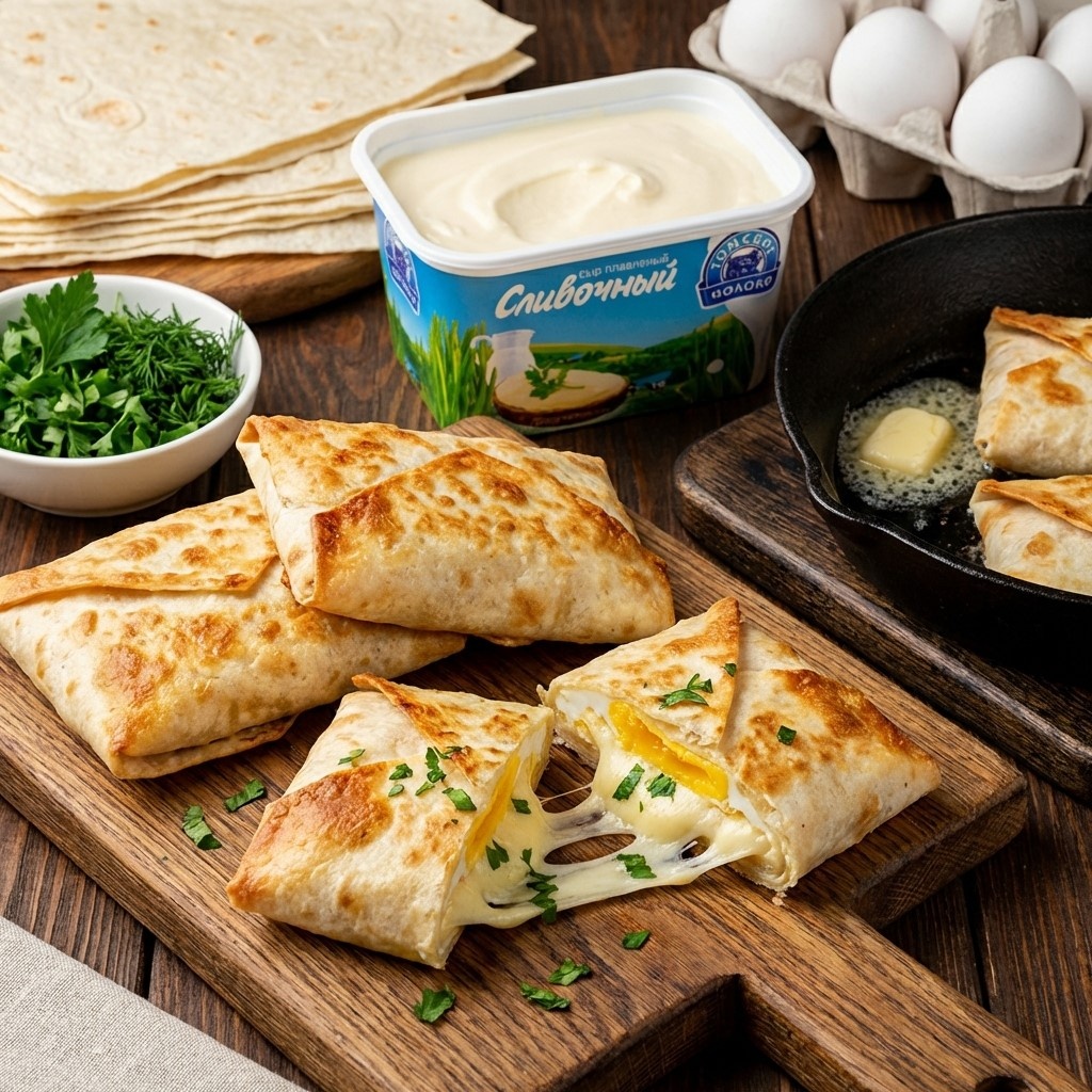 Подойдёт для завтрака, перекуса или «что бы такого приготовить за 10 минут» Ингредиенты: - лаваш или тонкие лепёшки - плавленый сыр «Томское молоко» - 1–2 яйца - зелень по желанию - немного сливочного масла "Томское молоко" Как готовить: 1. Лаваш нарезаем на квадраты. 2. В центр выкладываем ложку плавленого сыра. 3. Сверху — яйцо (можно целиком или слегка размешать). Добавляем зелень. Сворачиваем конвертом. 4. Обжариваем на сковороде с небольшим количеством масла до румяной корочки. В итоге —