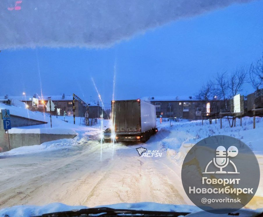 Один из двух выездов с жилищного комплекса, тот что рядом с гипермаркетом на Большевистской, оказался частично заблокирован фурой. Спустя несколько часов тягач застрял на неочищенной дороге с глубокой колеёй на улице 2-й Обской, после чего осталась только одна полоса проезда. Говорит Новосибирск