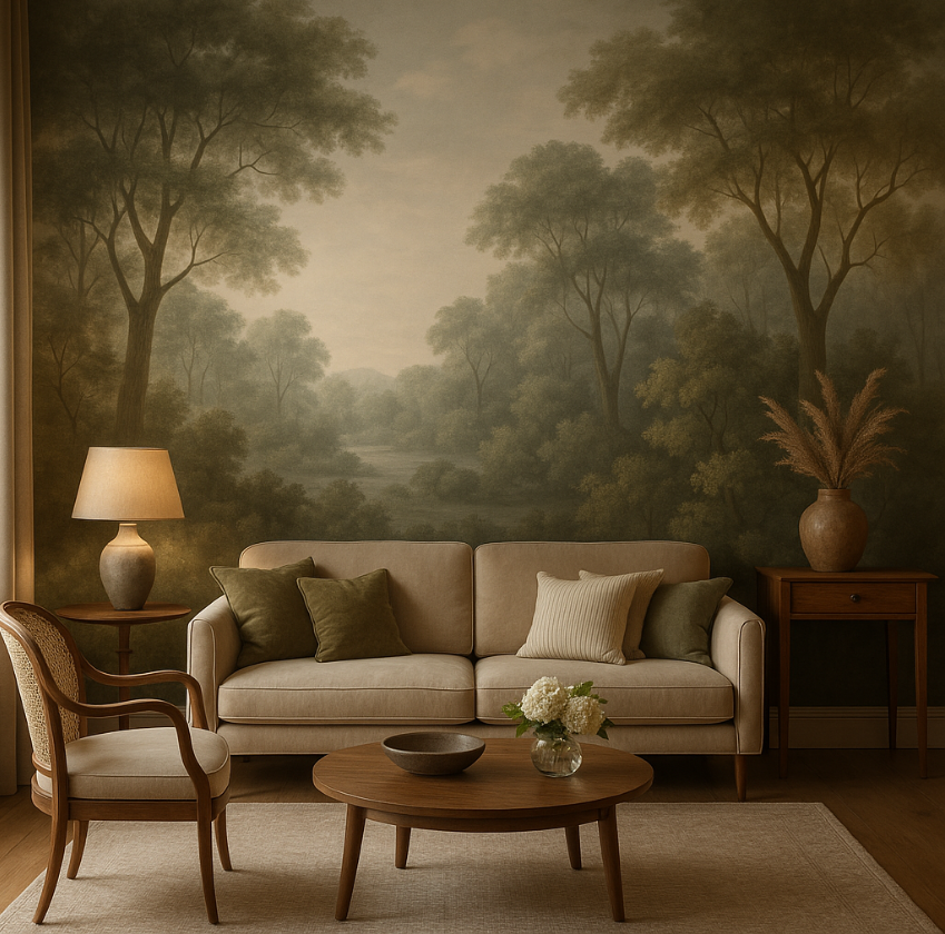 — 70/20/10: фон / мостик / акцент. Повторите ключевой цвет фрески в 2–3 предметах интерьера (подушка, лампа, ковер). 6. Фактура и носитель