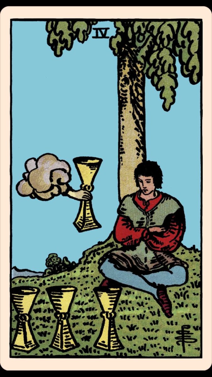 Четвёрка Кубков - одна из тех, что говорит тихо, но пронзительно. Она не грозит бедой, не сулит триумф - она просто сидит в тени, опустив глаза, и ждёт, пока вы заметите то, что уже лежит у ваших ног. Эта карта - зеркало внутренней усталости, духовного пресыщения или, наоборот, жажды чего-то настоящего. Сегодня мы заглянем в её символы, раскроем магию созерцания и предостережём от одной очень коварной ловушки… На карте Уэйта юноша сидит под деревом, скрестив руки и ноги. Перед ним - три кубка, стоящие в ряд, будто дары судьбы. Четвёртый кубок протягивается ему сверху невидимой рукой - знак нового предложения, возможности, приглашения к переменам. Но он даже не смотрит в его сторону. Его взгляд устремлён внутрь, в туман размышлений. Символика: - Дерево - связь с жизнью, корнями, но также и с застоем (корни не двигаются). - Три кубка - уже полученные блага: любовь, дружба, стабильность. - Четвёртый кубок - новая возможность, часто