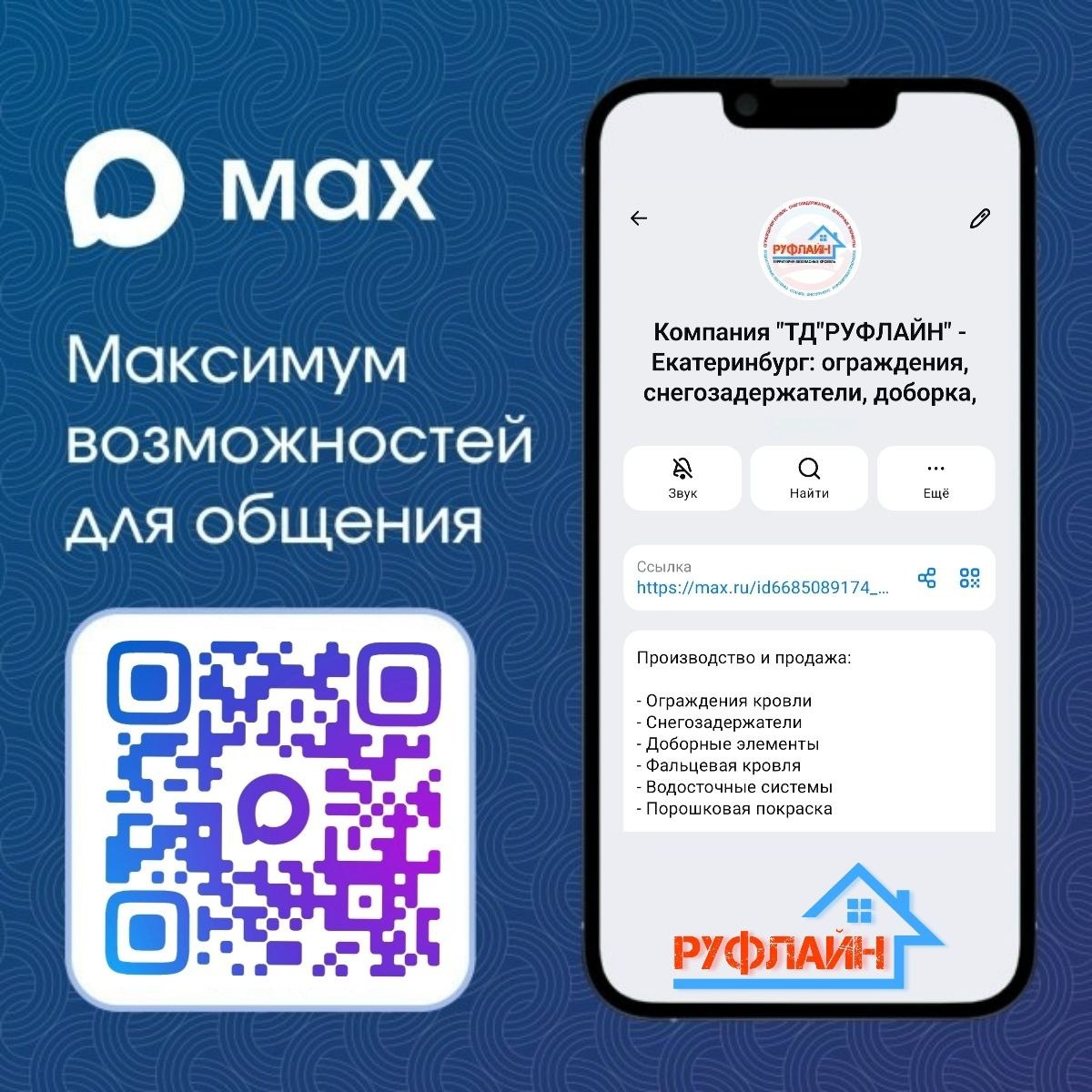 ! Наша компания ООО "ТД" РУФЛАЙН" запустила официальный канал в MAX, где вы сможете находить актуальные новости, полезные материалы и важную информацию о продукции нашей компании. Присоединяйтесь к нашему каналу, чтобы всегда быть в курсе событий и делиться своими идеями! Не упустите возможность быть частью нашей дружной семьи РУФЛАЙН! Ссылка на канал: https://max.ru/id6685089174_biz ООО "ТД"РУФЛАЙН" - забота о Вашей безопасности! Tel - Telegram - Max +7(343)207-65-68 +7(922)021-97-56 pm3@uralroof.ru http://руфлайн66.рф https://dzen.ru/id/6238c4888f56b3749c570a09 https://t.me/roofline66 https://t.me/roofline_ekb http://t.me/roofsalebot/app