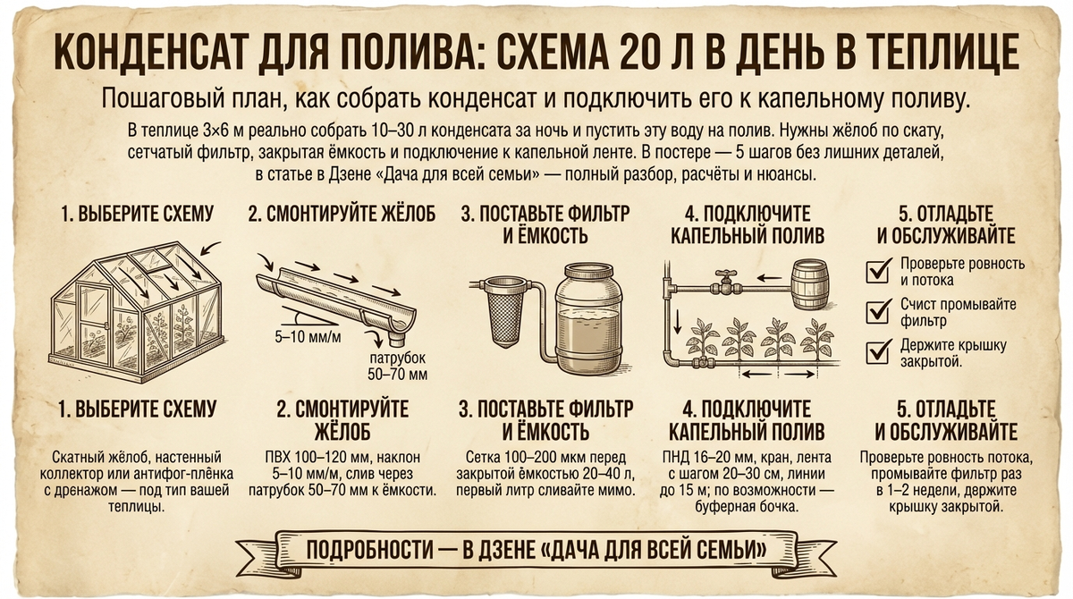 Готовое решение для теплицы 3×6 м такое: ставим ПВХ-жёлоб по внутреннему краю ската, делаем слив конденсата через сетчатый фильтр 100–200 мкм в закрытую ёмкость 20–40 л и оттуда подключаем капельную ленту через ПНД-трубу 16–20 мм. При ночном перепаде температур 10–15 °C это даёт 10–30 л в сутки, 20 л в день достижимы без экзотики. Альтернативы под задачу: гидрофильная антифог-плёнка с периферийным дренажом или настенный коллектор. Ключевое требование одно — собрать воду до падения капель на листья, иначе конденсат нарастит грибные болезни.