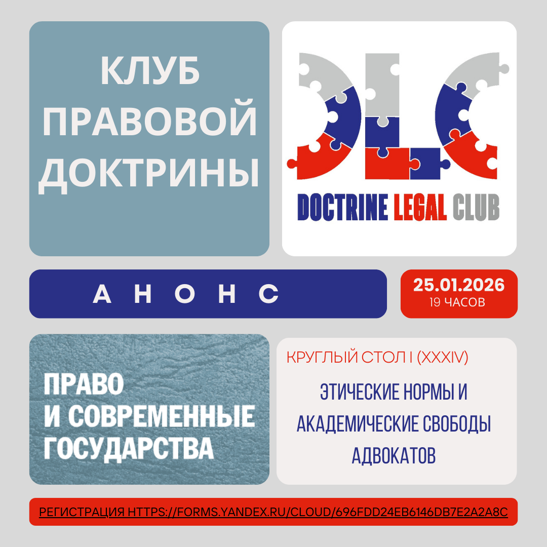 ПРОГРАММА КРУГЛОГО СТОЛА «Этические нормы и академические свободы адвокатов» 25 января 2026 года Клуб Правовой Доктрины, онлайн формат время работы с 19:00 до 21:00 часов Регистрация на Круглый стол https://forms.yandex.ru/cloud/696fdd24eb6146db7e2a2a8c Руководители Круглого стола Бошно Светлана Владимировна, доктор юридических наук, Doctor Of Juridical Science, профессор, адвокат. Румянцева Елена Евгеньевна, доктор экономических наук, профессор, на протяжении 12 лет профессор РАНХиГС при Президенте РФ, эксперт НИУ «Высшая школа экономики». Персональный анонс https://dzen.ru/a/aFgwWrp1aUIypSO3 и интервью https://dzen.ru/video/watch/6892713ba5f0de24403973d7 Аверин Александр Валентинович, доктор юридических наук, профессор кафедры теории и истории государства и права, Владимирского филиала Российской академии народного хозяйства и государственной службы при Президенте РФ. Персональный анонс https://dzen.ru/a/aRbD1uIeMETHMtwn Модератор секции Селезнева Елизавета Алексеевна, кандидат ю